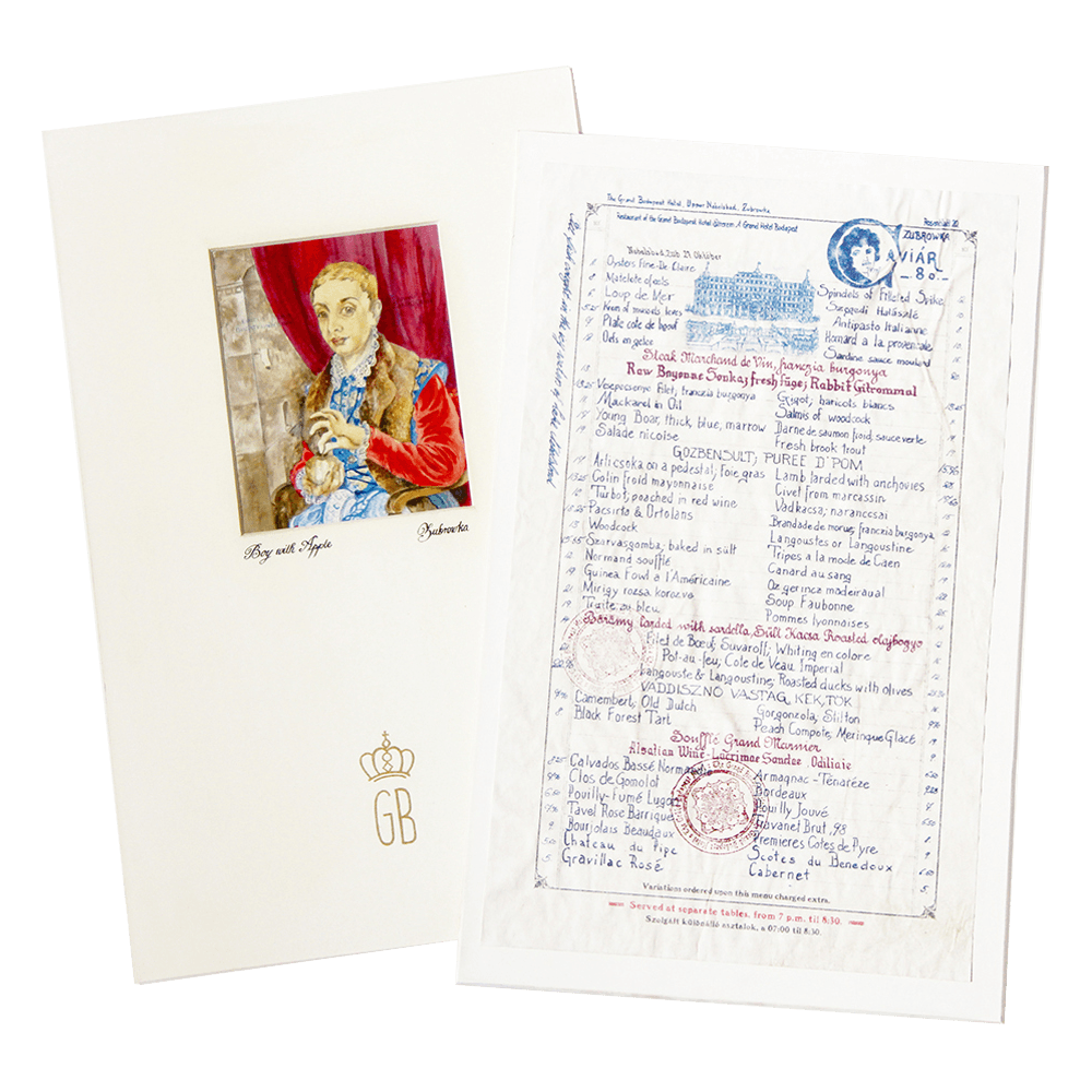 The menu of the hotel restaurant was needed for the dining scene to take place. However, another layer of interpretation is intentionally added in the prop for the featuring of Boy with an Apple painting, which is a relevant piece in the film, but an element yet to be introduced in the story. In fact, the painting plays a central role in the story, but in the menu, a watercolor reproduction is intentionally featured instead of a photographic copy, giving the impression that it was created as a tribute to the original.