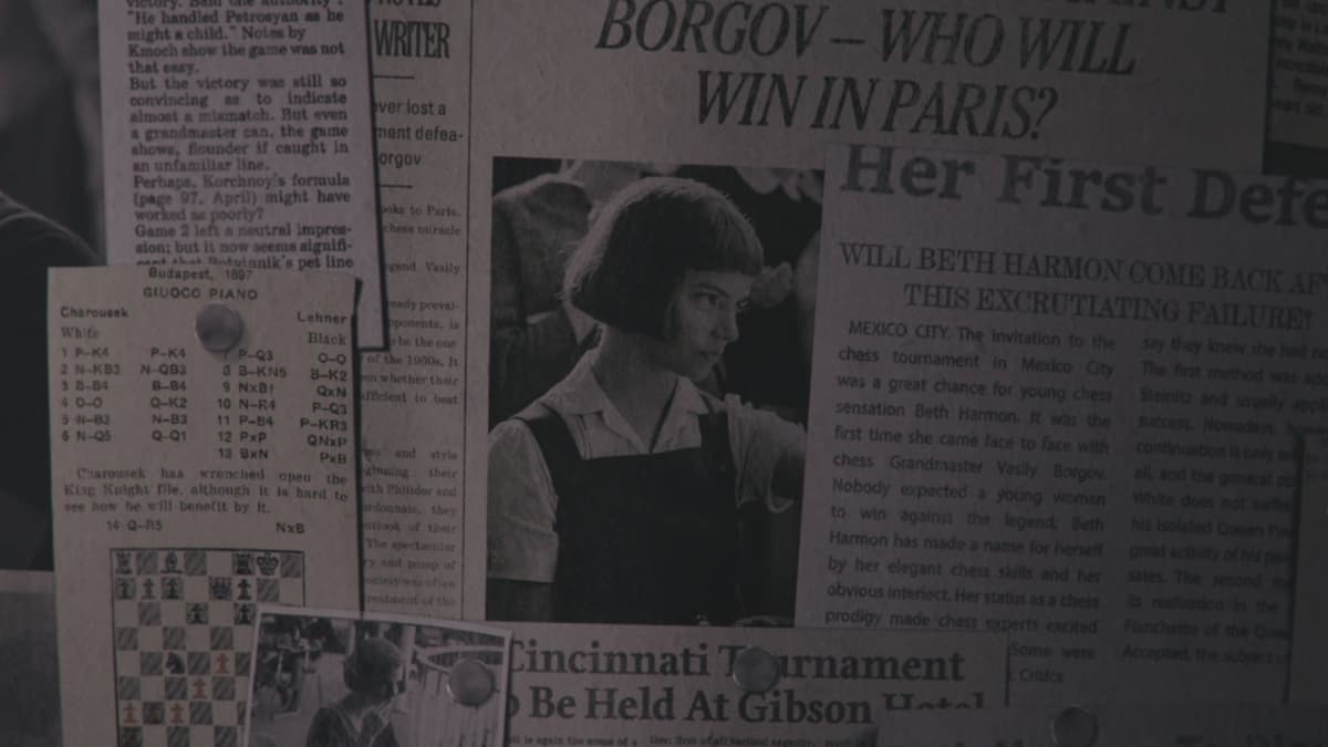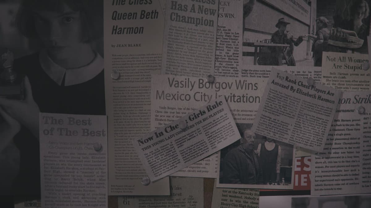 Large board made by the protagonist Beth’s mentor and guardian of the orphanage she grew up in. The board is plastered with newspaper clippings, photos, magazine covers and moments from the protagonist’s childhood and success. It visualizes Beth’s growth, honors her mentor, and reinforces her motivation—offering narrative closure and character insight without words.