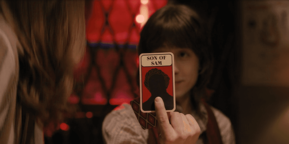 Son of Sam is a card game invented by a younger Oliver, based on his peculiar ability to spot people’s “tells.” Convinced that the killer is “artist-like,” Oliver and Charles grow suspicious of Mabel’s new friend Alice, who presents herself as an Oxford-educated artist from a wealthy family. To test her, Oliver brings Son of Sam to the party they’re attending. As the game begins, he rapidly reframes the gathering as a 1970s-themed scenario and narrows the room down to a tense three-way exchange between Oliver, Mabel, and Alice. The game stops being a simple pastime and becomes a way to turn suspicion into a performance, with Oliver effectively directing the room and forcing everyone into roles. By using play as a pressure device, he tries to make the “truth” surface through discomfort and confrontation rather than through evidence alone, showing how easily investigation can blur into accusation. Oliver accuses Alice of lying, and therefore of being the killer. Alice ultimately admits she is not from a rich family and did not study at Oxford, then leaves.