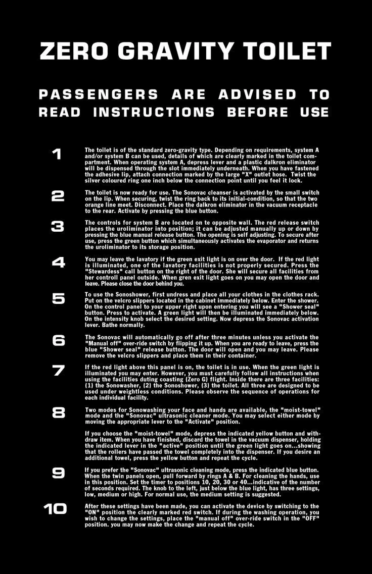 The instructions explaining how to use the toilet in space reveal a mundane action becoming more complicated. The packaging and the instructions are used to show rather than tell the audience the difficulties of space travel, alongside human limitations in this specific environment